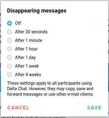 Another new feature in all recent Delta Chat versions on all platforms are the so called Disappearing messages, similar to the Signal messenger offering.