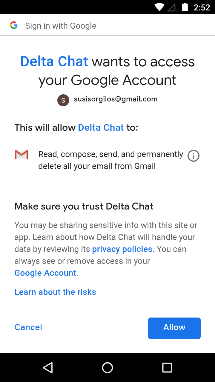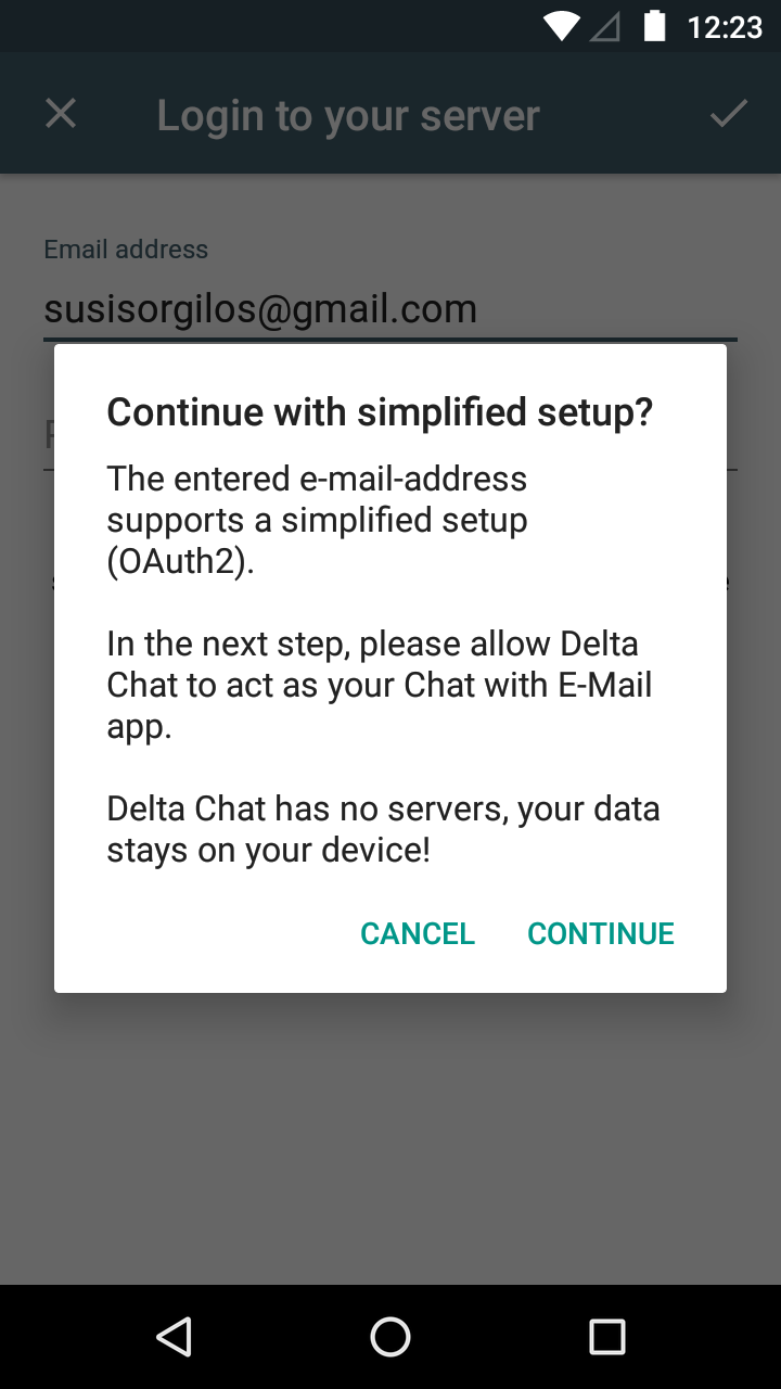 This means that you only need to provide your e-mail address and GMail/Yandex will then ask you to confirm to give access to your e-mail account so that Delta can send and display chat messages. Please remember that Delta Chat is serverless as well. All Delta Chat apps are Open Source and can be verified to not transmit your address/account information anywhere else than with the e-mail provider of your choice.