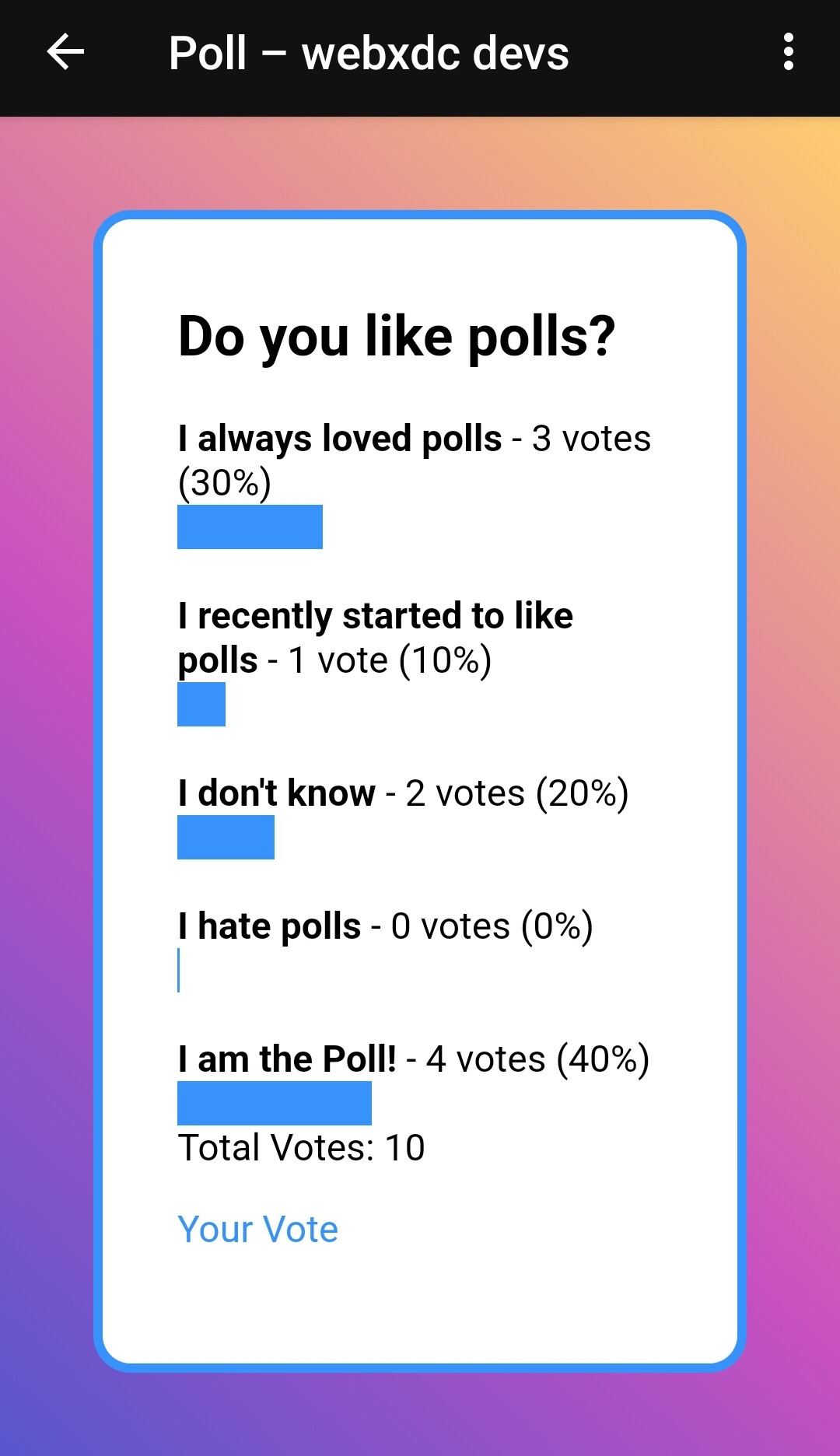 Our Poll example app is 6 kilobytes large and, as with all webxdc apps shared in a chat, it features these wonderful properties and UX conveniences:
