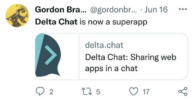 Sharing web apps in a chat (webxdc) was released in mid-2022.